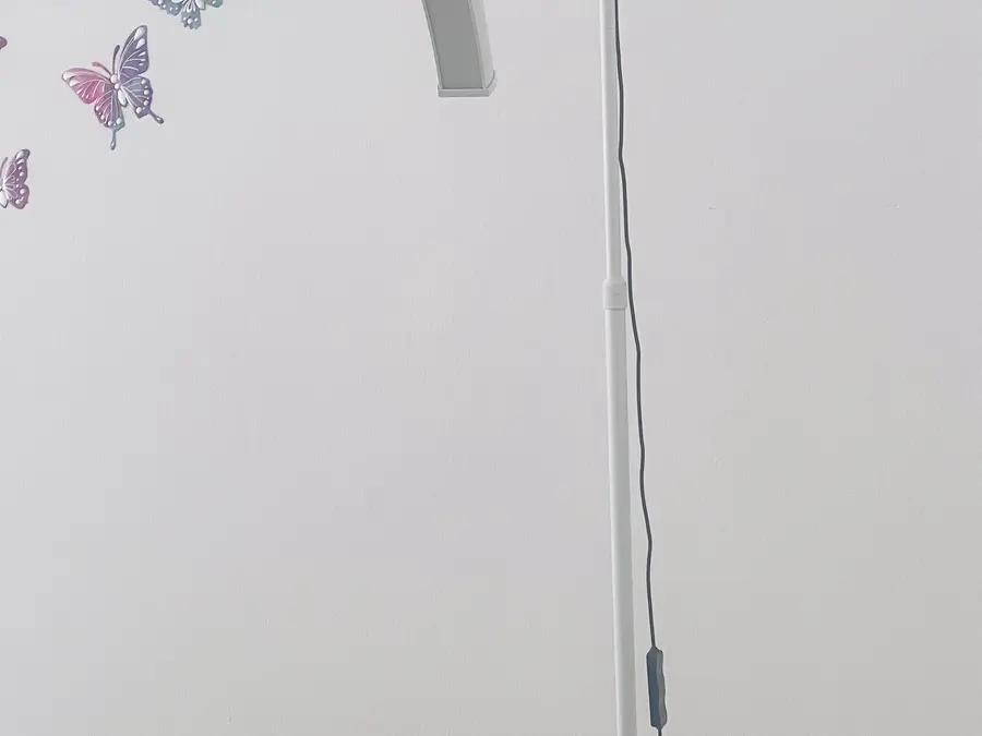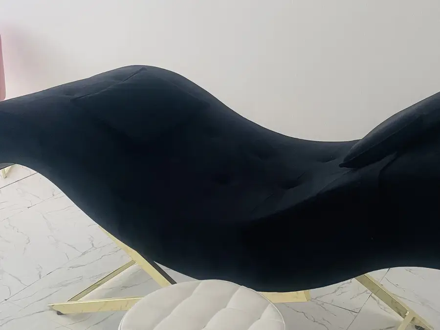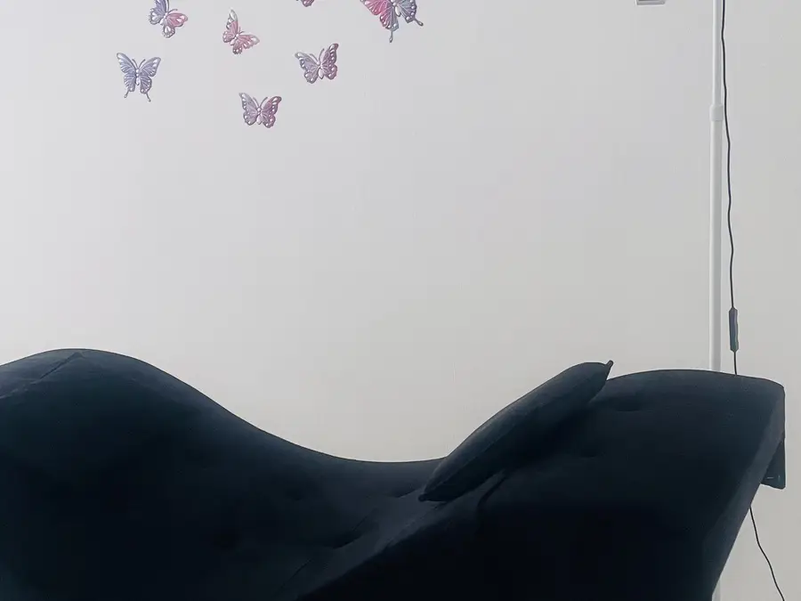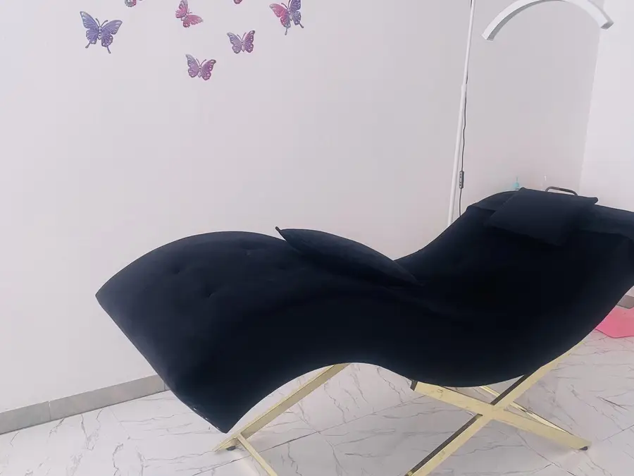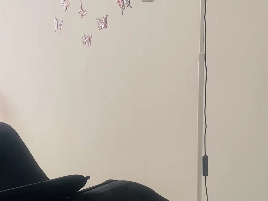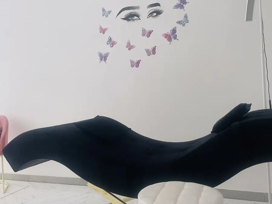 Krevati i qerpikeve i zi me jasteket, stoli i bardhe dhe llampa e qerpikeve me pultin per ndryshimin e ngjyres se drites dhe intensitetin e saj .
